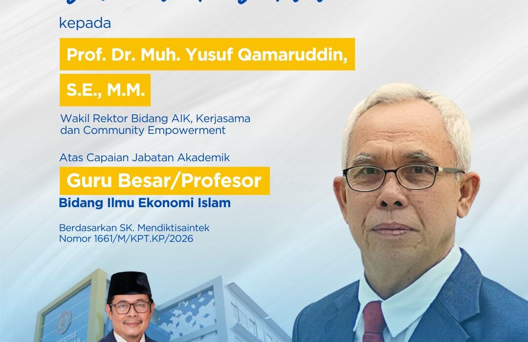 WR III UMPalopo Dr. Muh. Yusuf Qamaruddin Resmi Raih Guru Besar Bidang Ekonomi Islam Universitas Muhammadiyah Palopo (UMPalopo) kembali menorehkan capaian akademik melalui diraihnya jabatan Guru Besar bidang Ilmu Ekonomi Islam oleh Wakil Rektor III Bidang Kemahasiswaan, Alumni, dan Bisnis, Dr. Muh. Yusuf Qamaruddin, S.E., M.M.. Pencapaian tersebut ditandai dengan terbitnya Surat Keputusan Guru Besar