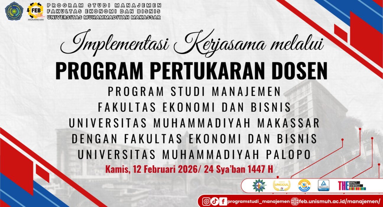 PRODI MANAJEMEN UMPALOPO DAN UNISMUH MAKASSAR IMPLEMENTASIKAN PROGRAM PERTUKARAN DOSEN MENGAJAR Palopo – Program Studi Manajemen Fakultas Ekonomi dan Bisnis Universitas Muhammadiyah Palopo melaksanakan Program Pertukaran Dosen Mengajar bersama Program Studi Manajemen Fakultas Ekonomi dan Bisnis Universitas Muhammadiyah Makassar sebagai tindak lanjut implementasi kerja sama akademik antarperguruan tinggi.Dalam program ini, dosen dari Prodi Manajemen Unismuh